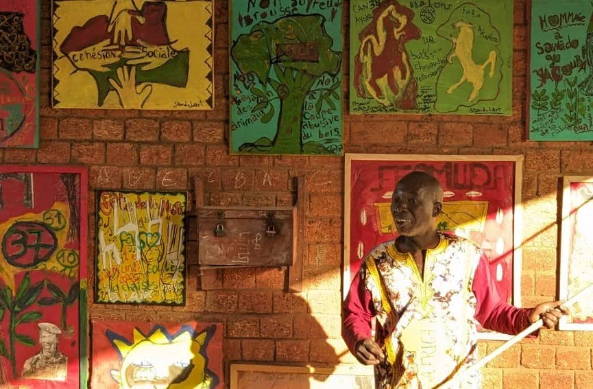 Traoré is a self-taught artist, born on December 12, 1971, in Dano, Burkina Faso where he resides to this day. His journey as an artist is inspired by his deep passion for Dagara culture and youth education. He is a primary school teacher, and his career as an artist began through teaching art to children.